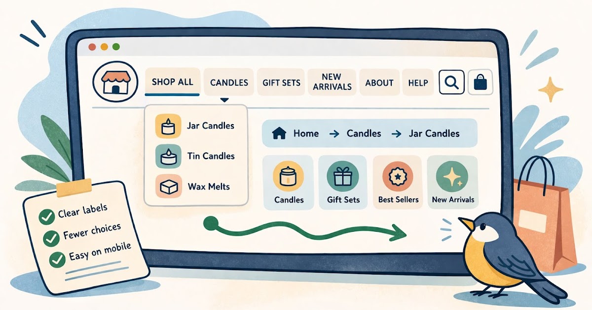 Most small stores do better with a short top-level menu than a long one. If everything is in the main navigation, nothing feels important.